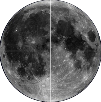 The white cross marks moon latitude = 0 (equator) and moon longitude = 0. Dark areas show marie and bright area show highlands in visual spectrum.